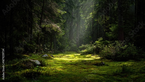 Fototapeta premium Sunlight streams through a dense forest