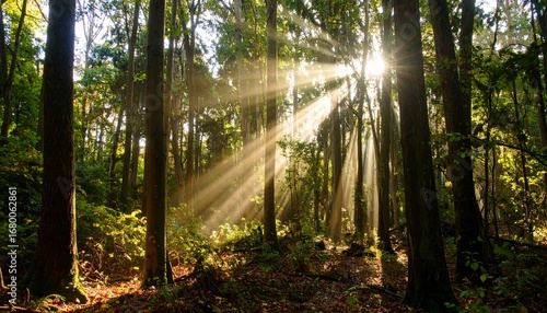 Fototapeta premium Sunlight streams through a dense forest