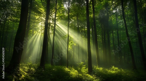 © Genta, Obraz premium Sunlight streams through a dense forest canopy.