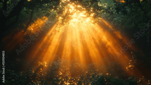 Naklejka premium Sunlight streams through a dense forest canopy