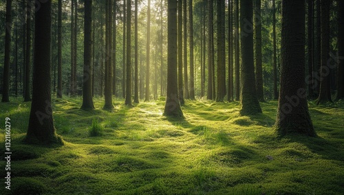 Obraz premium Sunlight streams through a dense forest floor covered in moss