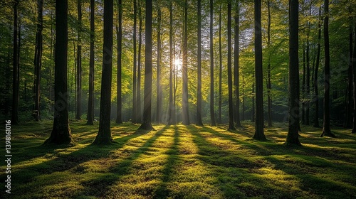 © Specelectra, Obraz premium Sunlight streams through a dense forest, illuminating the mossy forest floor with long shadows.