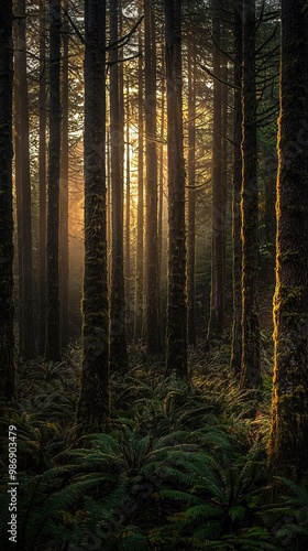 © nurman, Fototapeta premium Sunlight streams through a dense forest, illuminating the tall trees and ferns.