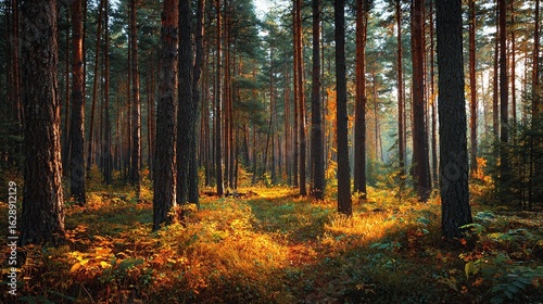 © Johan, Fototapeta premium Sunlight streams through a dense forest, illuminating the trunks and undergrowth with golden hues
