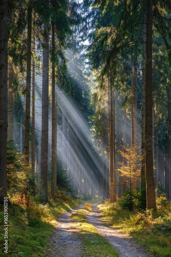 Obraz premium Sunlight streams through a dense forest path