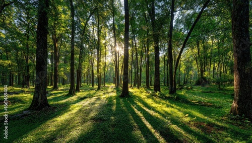Obraz premium Sunlight streams through a dense forest. Sunlight dappling forest floor