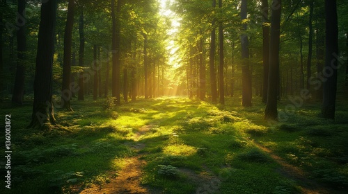 Obraz premium Sunlight streams through a dense forest. Sunlight illuminates a grassy path. Lush green vegetation surrounds tall trees. Golden light creates a magical atmosphere