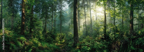 © Eksistensi, Obraz premium Sunlight streams through a dense, misty forest