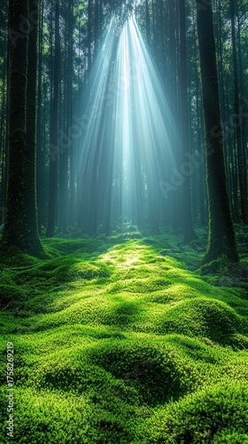 © Dece Std, Fototapeta premium Sunlight streams through a dense, mossy forest