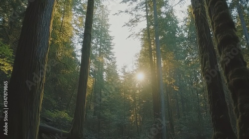 Obraz premium Sunlight streams through a dense old growth forest