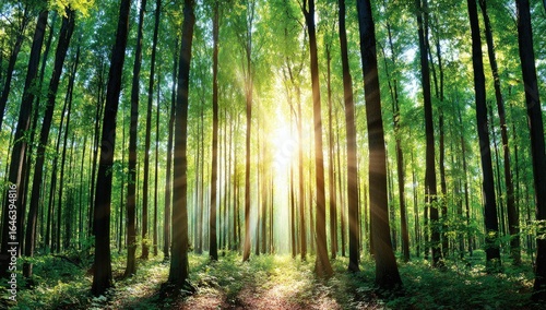© Adi, Obraz premium Sunlight streams through a dense, verdant forest