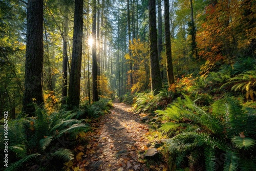 © Ruslan, Fototapeta premium Sunlight streams through a fall forest trail