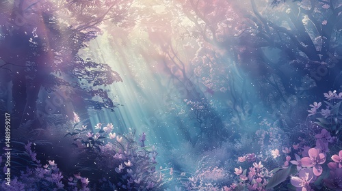 Fototapeta premium Sunlight streams through a forest canopy illuminating purple and white...