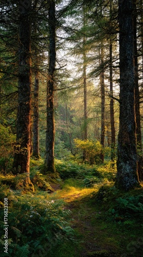 © syahfa, Obraz premium Sunlight streams through a forest, illuminating a path & lush greenery