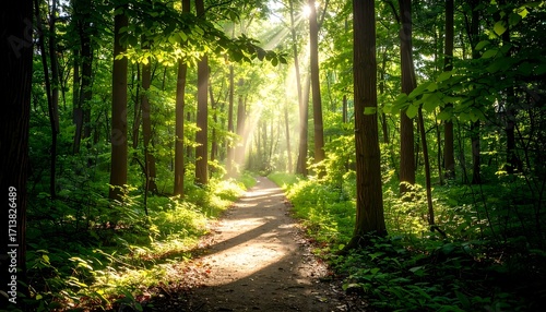 Obraz premium Sunlight streams through a forest path