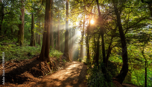 Fototapeta premium Sunlight Streams Through A Forest Path Illuminating Trees And Creating A...