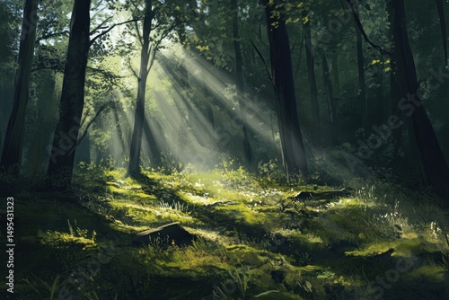 © Bagas, Obraz premium Sunlight streams through a lush forest