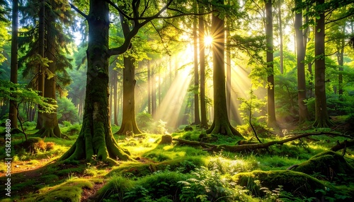 Obraz premium Sunlight streams through a lush forest (3)