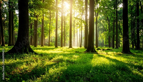 Obraz premium Sunlight streams through a lush forest