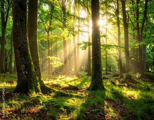 Obraz premium Sunlight streams through a lush forest (4)