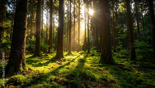 © Belajar, Fototapeta premium Sunlight streams through a lush forest (3)