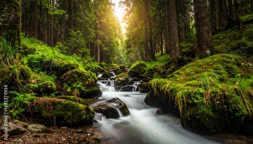 © Bismillah, Obraz premium Sunlight streams through a lush forest, cascading down a mossy stream