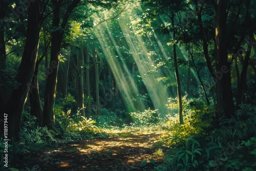 Obraz premium Sunlight streams through a lush forest, creating a serene atmosphere.