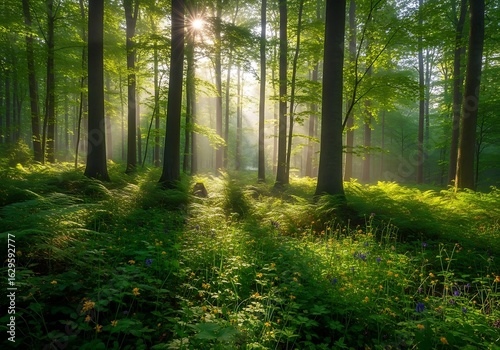 Obraz premium Sunlight streams through a lush forest floor.