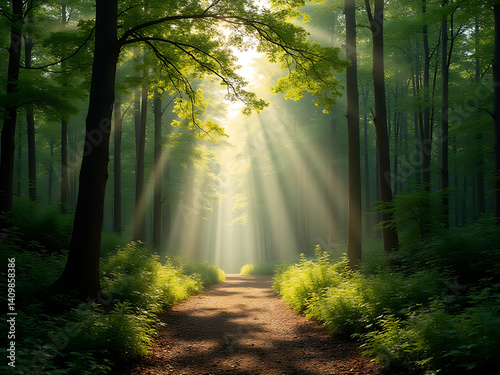 Fototapeta premium Sunlight streams through a lush forest illuminating a path surrounded by...