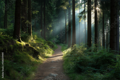 © Tobias, Fototapeta premium Sunlight streams through a lush forest, illuminating a winding trail. Nature's beauty creates a serene and peaceful escape.