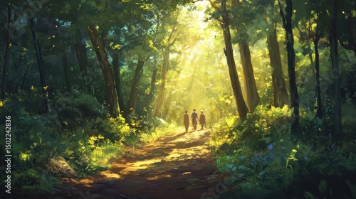 Fototapeta premium Sunlight streams through a lush forest path, three figures walking. Lush...