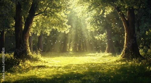 © ika, Fototapeta premium Sunlight streams through a lush forest with many flying birds