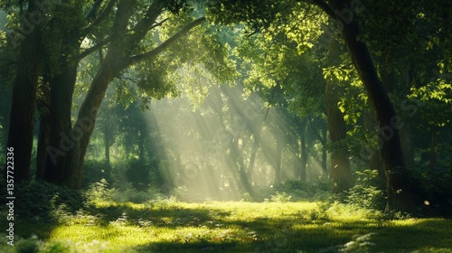 © Chotijah, Fototapeta premium Sunlight Streams Through a Lush Green Forest Creating Bright Rays