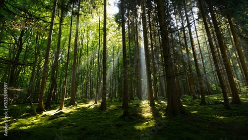 © Mehrab Nabil, Obraz premium Sunlight streams through a lush green forest woodland landscape