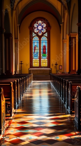 © Valentyna Prudnikova, Fototapeta premium Sunlight streams through a magnificent stained glass rose window, casting vibrant colors on the polished marble floor of this serene Gothic cathedral interior with wooden pews