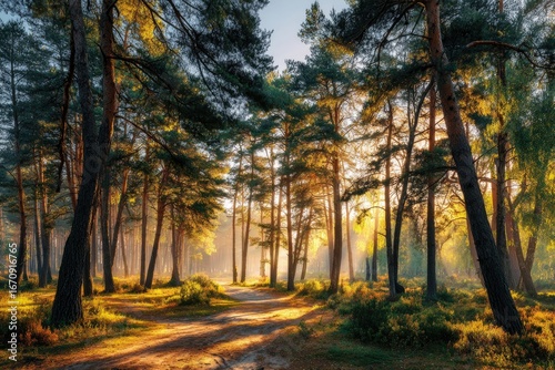 Obraz premium Sunlight streams through a misty autumn forest
