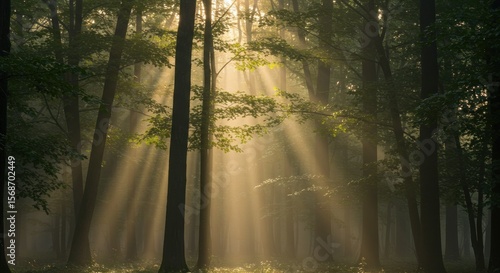© salahudin, Fototapeta premium Sunlight streams through a misty forest