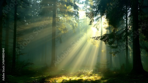 © rehan, Naklejka premium Sunlight streams through a misty forest.