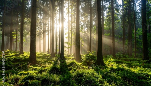 © Dia, Obraz premium Sunlight streams through a misty forest
