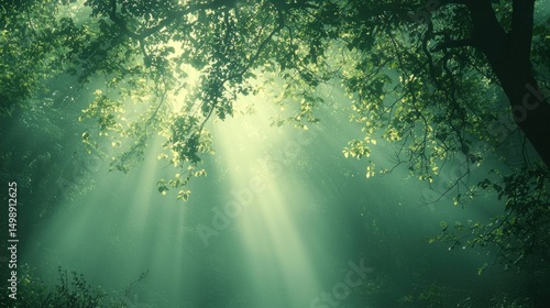 © Yeti, Obraz premium Sunlight streams through a misty forest canopy