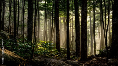 © tilah, Fototapeta premium Sunlight streams through a misty forest, illuminating patches of greenery amidst towering trees and rocky terrain.