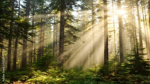 Obraz premium Sunlight streams through a misty forest, illuminating tall trees and vibrant...