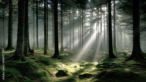 Obraz premium Sunlight streams through a misty forest, illuminating the mossy ground...