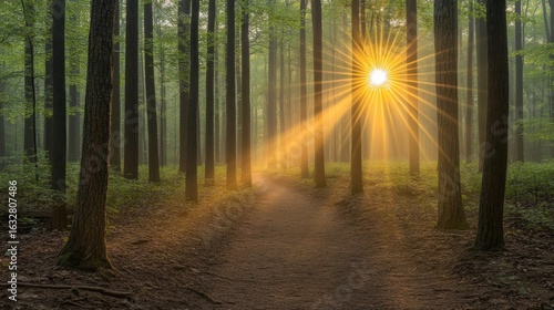 © embun, Obraz premium Sunlight streams through a misty forest path.