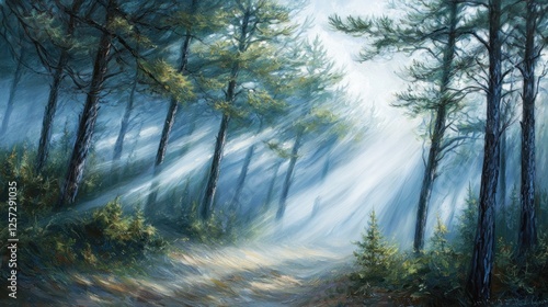 © Penatic Studio, Obraz premium Sunlight streams through a misty forest with tall pine trees