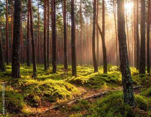 © sawal, Fototapeta premium Sunlight streams through a misty pine forest