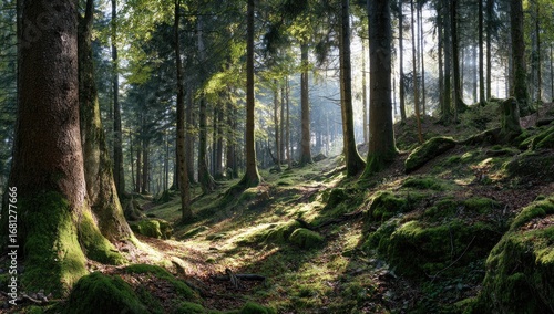 © Rindi, Fototapeta premium Sunlight streams through a mossy forest (2)