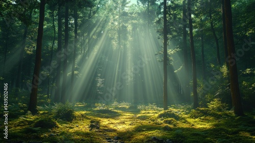 © TITISCAHYA, Obraz premium Sunlight streams through a mystical forest