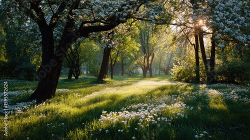 Naklejka premium Sunlight streams through a park filled with trees and wildflowers.