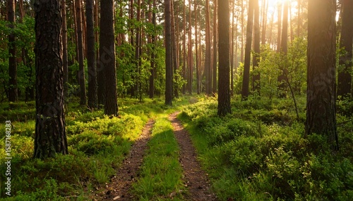 Obraz premium Sunlight streams through a pine forest (1)